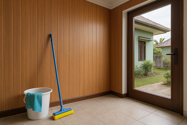 Ilustrasi interior rumah bergaya modern di Jawa Barat dengan dinding panel PVC, dilengkapi peralatan pembersih untuk perawatan harian. Ilustrasi oleh AI. |